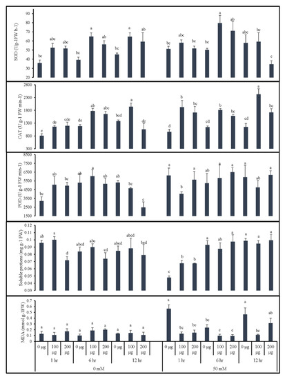 Effect of AGE priming on the antioxidant enzyme activities, lipid peroxidation, and soluble protein abundance of tomato. Primed seeds were germinated under 0 and 50 mM NaCl stress. Data for antioxidant enzyme activities of catalase (CAT), peroxidase (POD), and superoxide dismutase (SOD), malondialdehyde content (MDA), and soluble protein abundance are presented as means + standard errors (bars). All data were subjected to factorial ANOVA and post hoc Tukey’s honestly significance difference (HSD) at p = 0.05. Means followed by the same letters bear no statistical difference.