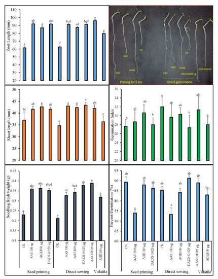The data for germination percentage (%), germination index, seedling fresh weight (g), and root and shoot length (mm) of tomato seedlings germinated under different treatments of AGE (100 µg∙mL−1), DADS (0.029 µg∙mL−1), or AAS (100 and 0.0039 µg∙mL−1) are provided in Figure 5.