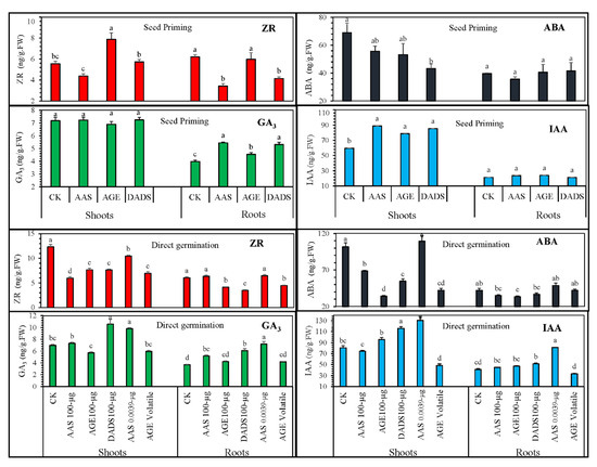 Post-germination phytohormonal regulation in tomato shoots and roots. The endogenous phytohormones auxin (IAA), gibberellic acid (GA3), cytokinin (ZR), and abscisic acid (ABA) are presented. Tomato seeds were germinated after seed priming or, under an allelochemical medium of 100 µg∙mL−1 AGE, 0.29 µg∙mL−1 DADS, or AAS (100 and 0.00039 µg∙mL−1). Bars represent means and standard errors after ANOVA and HSD test.
