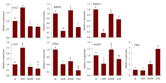 The biological effects of AGE and allelochemicals DADS and AAS, as well as the relative expression of numerous genes associated with plant defense and phytohormonal regulation, were observed after seed germination. The observed genes included CHI3 chitinase, auxin-responsive protein (IAA2), like-auxin (LAX5), respiratory burst oxidase homolog (RBOH1), mitogen-activated protein kinase MAPK7 and MPK2 and SODCC1. Primers were designed (Table S1, Supplementary Materials) using Primer3 and Basic Local Alignment Search Tool (BLAST), and the specificity of each primer for its corresponding gene was verified. Methods described by Cheng et al. (2016) [28] were used to extract plant complementary DNA (cDNA) for PCR. Briefly, the expression profiles of selected genes were evaluated in tomato seedlings directly grown under AGE, DADS, and AAS. The total RNA of tomato plantlets was isolated using the Column Plant RNAout (Tiandz Inc., Beijing, China) according to the manufacturer’s instructions and then treated with RNase-free DNase I (Promega, Madison, WI, USA) to remove the contaminating genomic DNA. Reverse transcription (RT) was carried out using the RevertAid RT Reverse Transcription kit (Thermo Fisher Scientific) according to the manufacturer’s instructions. The cDNA was used for real-time fluorescent quantitative PCR (qPCR) with specific primers. The qPCR used was EvaGreen 2× qPCR Master Mix (abm, made in Canada), according to the manufacturer’s guidelines, and the instrument used was an Applied Biosystems Step One Real-Time PCR System (iQ5, Bio-Rad, USA). Data analysis was carried out using the 2−ΔΔCt method and the levels of gene expression relative to the water control [31]. For each gene analysis, three biological replicates were performed.
