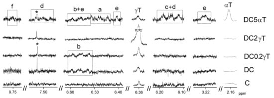 The 1H NMR spectra of the original oil C, and of the oil samples enriched with each one of the tocopherols at the different concentrations (C0.2αT, C2αT, C5αT; C0.2γT, C2γT and C5γT), and of the lipids extracted from their digestates (DC, DC0.2αT, DC2αT, DC5αT, DC0.2γT, DC2γT and DC5γT), were acquired in duplicate using a Bruker Avance 400 spectrometer operating at 400 MHz. For this purpose, the above-mentioned samples (approximately 0.16 g) were dissolved in 400 µL of deuterated chloroform, which contained tetramethylsilane (TMS), as an internal reference (Cortec, Paris, France). The acquisition conditions were the same as those used in previous studies []. It must be noted that the relaxation delay and acquisition time allow the complete relaxation of the protons, the signal areas thus being proportional to the number of protons that generate them, making it possible to use them for quantitative purposes.