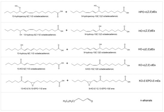 These signals, their chemical shifts and assignments are given in Tables S2–S5 (Supplementary Material). Their assignments were made, taking into account previous studies as indicated in each table, or on the basis of the signals of standard compounds acquired for this study. Among the latter are: trans-12,13-epoxy-9-keto-10(E)-octadecenoic acid, linolein hydroperoxides, linolein hydroxides, 9-oxo-10E,12Z-octadecadienoic acid and 13-oxo-9Z,11E-octadecadienoic acid purchased from Cayman Chemical (Ann Arbor, MI, USA), 9(S)-Hydroxy-10(E),12(E)-octadecadienoic acid (Dimorphecolic acid), acquired from Larodan (Malmö, Sweeden).