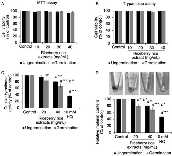 Effects of germinated riceberry rice extract on cellular tyrosinase and total melanin content in B16 cells. B16 cells were treated with ungerminated and germinated riceberry rice extracts at concentrations of 10, 20, 30, and 40 mg/mL and then tested for cytotoxicity by the MTT assay (A) and the trypan blue assay (B). Non-cytotoxic doses at 20 and 40 mg/mL were used on B16 cells for cellular tyrosinase activity (C) and melanin content (D). All results were expressed as the mean ± SD by comparing with 100% of untreated cells. Ten millimolar of hydroquinone (HQ) was used as a positive control. *, **, *** Statistical significance at p < 0.05, p < 0.01, and p < 0.001 and a, b versus untreated cells and the ungerminated riceberry rice treatment group, respectively. Results from triplicate assays of two independent experiments.