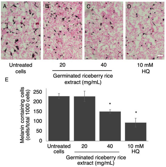 Effect of germinated riceberry rice extract on melanin pigmentation in B16 cells. Fontana–Masson’s staining of B16 cells (A), B16 cells treated with germinated riceberry rice extract at 20 (B) and 40 mg/mL (C), and 10 mM hydroquinone (HQ) (D). Melanin containing cells were counted by observing a total of 1000 cells under a light microscope at 100× magnification. Results were expressed as the mean ± SD from triplicate samples from two independent experiments (E). * Statistical significances at p < 0.001 when compared with untreated cells. Scale bar = 100 μm.
