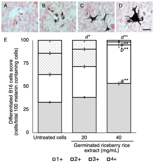 Effect of germinated riceberry rice extract on the morphological appearance of B16 cells. Differentiated B16 cells were scored as 1+ (A), 2+ (B), 3+ (C), and 4+ (D). Scoring was conducted by observing a total of 100 melanin containing cells under a light microscope at 100× magnification. Results were expressed as the mean ± SD from triplicate samples from two blinded independent experiments (E). *,** Statistical significances at p < 0.05 and p < 0.001 and a, b, c, d versus a score of 1+, 2+, 3+, and 4+ of untreated cells, respectively. Scale bar = 50 μm.