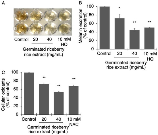 Melanin excretion is a spontaneous characteristic of differentiated B16 cells. Likewise, the treatment of B16 cells with germinated riceberry rice extract at the concentrations of 20 and 40 mg/mL significantly inhibited the melanin excretion in a dose dependent manner to 72 ± 9.87% (p = 0.001) and 45 ± 4.15% (p < 0.001), respectively, when compared with untreated cells (100%) (Figure 4A,B).