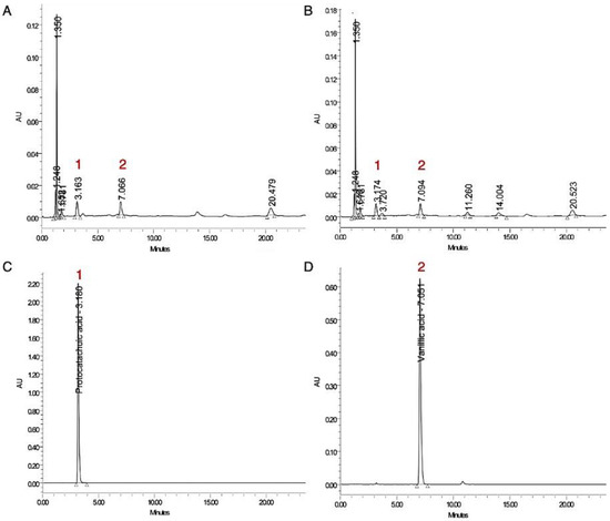 The HPLC chromatogram of ungerminated riceberry rice extract (A), germinated riceberry rice extract (B), standards 1: protocatechuic acid (C) and 2: vanillic acid (D).