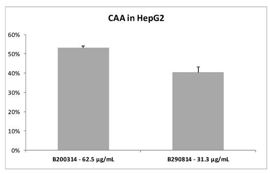 To obtain a better prediction of the antioxidant activity of seaweed extracts we measured their ability to prevent the radical formation by CAA assay using HepG2 cells. The results, presented in Figure 1, indicate that both seaweed extracts were able in vitro to scavenge 50–60% of the AAPH-induced radicals. The extracts were active at very low concentrations (62.5 µg/mL and 31.3 µg/mL for B200314 and B290814, respectively); Trolox (50 µM = 12.5 µg/mL), used as a positive control, exhibited 98% cellular antioxidant activity.