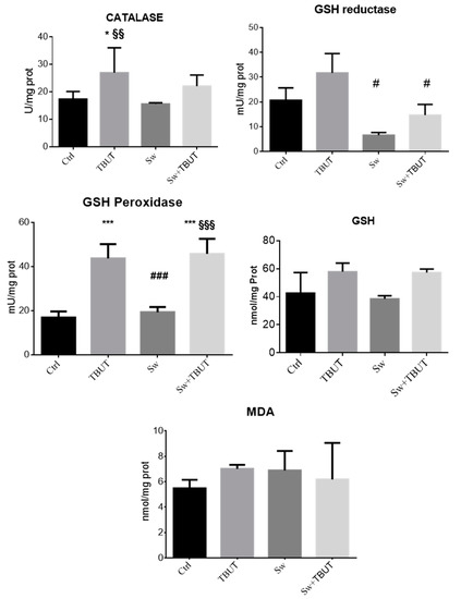 The results, shown in Figure 2, demonstrate that at this concentration, the seaweed extract displayed a protective effect on hepatic cells. In fact, the pretreatment with seaweed (Sw) extract determines a significant reduction of GSH reductase activity induced by TBUT exposure (Sw + TBUT vs. TBUT p < 0.05). Moreover, we observed a slight decrease of catalase activity induced by TBUT stress in cells pretreated with seaweeds, although this was not statistically significant. GSH peroxidase activity and total glutathione content remained to the level of stressed cells. No effects were observed in malonyldialdehyde (MDA) levels, the typical marker of lipid peroxidation, which were slightly increased by TBUT treatment.