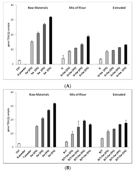 Interestingly, the different flavorings, when added to mix of flour, showed an increment of TEAC value also in the absence of seaweed. Additionally, flavored extruded samples, without seaweed, showed an antioxidant potential in particular for rosemary and basil + tomatoes. Moreover, in a mix of flour and extruded snacks with different concentrations of seaweed, the antioxidant activity was similar, suggesting that the extrusion process did not modified the biological activity.