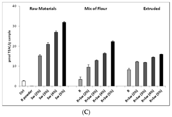 Trolox equivalent antioxidant capacity (TEAC) values for raw materials, mix of flour and extruded snacks with (A) 1% Garlic (G), (B) 0.5% Basil (B) + 3% Tomato (T), and (C) 0.5% Rosemary (R) powders and increasing concentration of seaweed extract (Sw). Ctrl consists in rye mix. Data are expressed as mean ± SD of three independent experiments.
