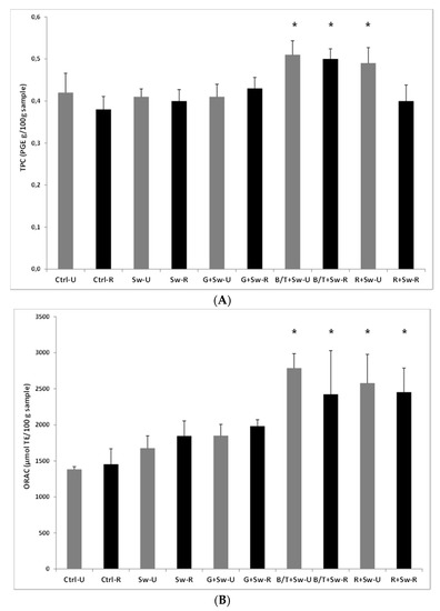 (A) TPC and (B) ORAC values (µmol TE in 100 g sample) of roasted (R) and unroasted (U) rye snacks containing different flavorings, i.e., 1% garlic (G), 0.5% basil (B) + 3% tomato (T) or 0.5% rosemary (R) powder. All groups contained rye mix, 0.8% Himalayan salt and 2.1% seaweed extract (Sw, batch B200314), except the control group, which only contained rye mix and 0.8% Himalayan salt (Ctrl). Data are expressed as mean ± SD of four independent experiments. * p < 0.05 vs. Sw-U and Sw-R groups.