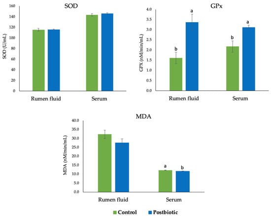 Serum antioxidant activity in post-weaning lambs supplemented with postbiotics from L. plantarum RG14. SOD: Superoxide dismutase, GPX: Glutathione peroxidase, MDA: Malondialdehyde. a,b Bar with different letters between treatment groups are significantly different (p < 0.05).