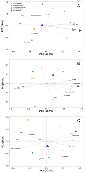 Principal component analysis (PCA) has been previously demonstrated as an effective way of collectively representing sample population differences over multiple traits of productivity and quality in response to numerous cultivation factors [13,14,61]. In the current study, the PCA enabled a summarized view of the relations between microgreens crop performance and the compositional variables assessed (Figure 2A–C). Owing to the significant species-substrate interaction observed on most of these variables, PCA analysis was performed separately for each species. As a result, the species-dependent effects of the five substrates were better visualized and the quality of the PCA loading and score plots were improved, as indicated by the high percentage of the total variance (76.7–85.7%) accounted for the first two PCs. The main conclusive evidence provided with respect to the three species examined is the superiority of peat moss over other substrates in terms of microgreen yield and overall mineral content; however, peat moss also resulted in higher nitrate and lower dry matter content in microgreens across species. Chlorophyll content was particularly enhanced in microgreens grown on capillary mat and cellulose sponge. On the contrary, the concentrations of total polyphenols and major carotenoid molecules varied across substrates in a species-specific manner. For instance, total polyphenols were lowest on peat moss for coriander and pak choi microgreens, whereas kohlrabi microgreens grown on peat moss had the highest polyphenols. Therefore, the PCA representations underpin the main conclusion derived from the tabulated results (Table 2, Table 3, Table 4 and Table 5) that although the superiority of peat moss in several productive and compositional traits of microgreens is demonstrable, further research work is warranted to elucidate the interactive effects of substrate on certain quality traits of particular species. Although the synthetic substrates presently examined do represent competitive alternatives to peat moss, particularly in terms of growth rate, fresh yield and microgreens mineral composition, research work on finding viable alternatives to peat moss is warranted by sustainability issues associated with peat moss extraction [30], and also due to microbial safety aspects associated with the use of organic materials such as peat moss for microgreens production [22].