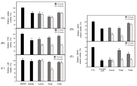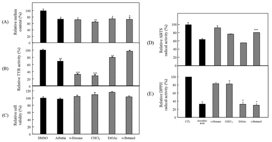 Anti-melanogenesis and antioxidant effects of each fraction of PAL. (A) Melanin content, (B) TYR activity (C) cytotoxicity in B16F10. (D) ABTS and (E) DPPH radical-scavenging activities. The data are expressed as the mean ± SD (n = 3) of three individual experiments. * p < 0.05, ** p < 0.01 and *** p < 0.001, compared with control.