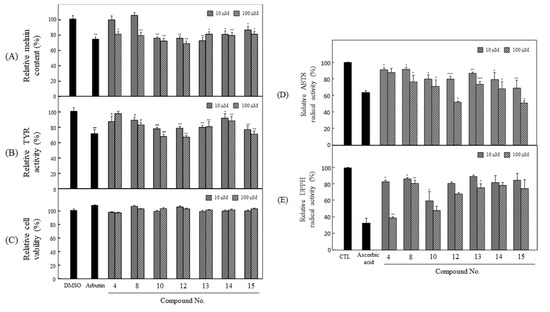 Among the fifteen phytochemicals, the anti-melanogenesis effects of compounds 1–3, 5–7, 9, and 11 are reported elsewhere. In particular, arbutin, a representative whitening material, was used as a positive control in this study [36,37,38,39,40]. With the exception of these compounds, seven compounds isolated from the n-butanol fraction were assessed for their anti-melanogenesis and antioxidant effects. To examine the anti-melanogenesis activity, the levels of melanin production and TYR activity in the pretreated cells were measured. As a result, HG and CH showed strong activities in melanin production (Figure 5A) and TYR activity (Figure 5B) without cytotoxicity (Figure 5C). The ABTS and DPPH radical-scavenging activities were examined, to determine the antioxidant effects of these compounds. Among these compounds, HG and CH exhibited strong DPPH (Figure 5D) and ABTS (Figure 5E) scavenging activity, respectively.