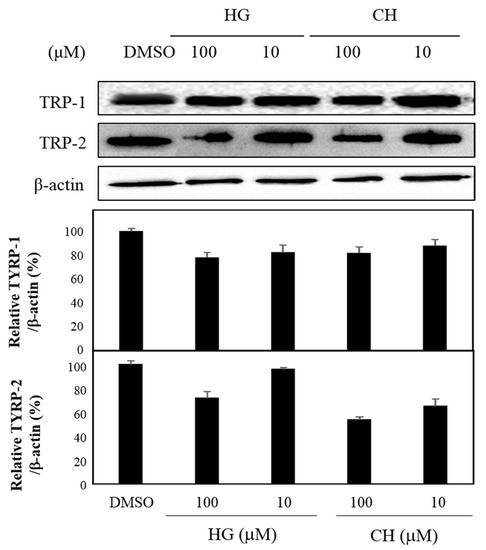 TYRP-1 and TYRP-2 are critical enzymes that influence the quantity and quality of melanin [12]. Among the fifteen compounds isolated from PAL, TYRP-1, and TYRP-2, the levels of HG and CH protein expression, which were not previously known to have an anti-melanogenesis effect, were determined by western blot analysis using the specific antibodies. As shown in Figure 6, HG and CH inhibited the expression of these proteins at 10 and 100 μM (Figure 6).