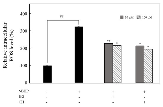 Effect of HG and CH on intracellular ROS levels in t-BHP-treated B16F10 mouse melanoma cells. The data are expressed as the mean ± SD (n = 3) of three individual experiments. ## p < 0.01 vs. non-treated group; * p < 0.05 and ** p < 0.01 vs. t-BHP-treated group.