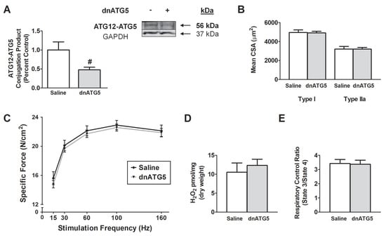 Effect of dominant negative ATG5 recombinant adeno-associated virus (rAAV-dnATG5) administration on: (A) ATG12-ATG5 conjugation, (B) soleus muscle fiber cross-sectional area (CSA), (C) soleus muscle-specific force production, (D) mitochondrial hydrogen peroxide (H2O2) emission, and (E) mitochondrial respiratory control ratio (RCR). Values are represented as means ± SEM. # significantly different versus Saline (p < 0.05).
