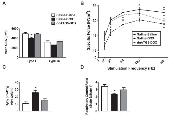 Effects of DOX and rAAV-dnATG5 administration on (A) soleus muscle fiber cross-sectional area (CSA), (B) soleus muscle-specific force production, (C) mitochondrial hydrogen peroxide (H2O2) emission, and (D) mitochondrial respiratory control ratio (RCR). Values are represented as means ± SEM. * significantly different versus all groups (p < 0.05). ^ significantly different versus Saline-DOX (p < 0.05).