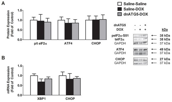 The endoplasmic reticulum (ER) stress response can modulate autophagy via increased eIF2α phosphorylation, which stimulates the upregulation of autophagy genes []. However, our results demonstrated that enhanced autophagy signaling following DOX administration does not occur as a result of activation of the canonical PERK/eIF2α-ATF4-CHOP pathway. Specifically, no differences existed in the phosphorylation of eIF2α, the protein expression of ATF4 and CHOP, and the mRNA expression of XBP1 and CHOP between any of the treatment groups (Figure 4A,B).