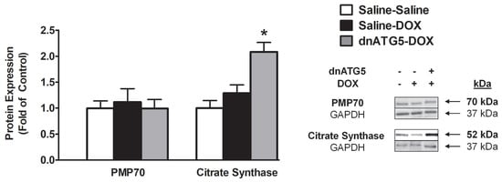 Skeletal muscle dysfunction prompted by accelerated autophagy may potentially be linked to altered rates of peroxisome and mitochondria removal []. To determine if DOX-induced autophagy modifies the concentration of these organelles within the soleus muscle, PMP70 and citrate synthase were assessed. Our results demonstrated that DOX treatment does not result in enhanced peroxisome degradation as no differences existed in the protein expression of PMP70 between groups. However, citrate synthase expression was significantly increased in the dnATG5-DOX animals compared to all other groups (Figure 5).