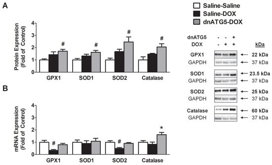 Soleus muscle antioxidant capacity was measured via assessment of the protein and mRNA expression of the endogenous antioxidant enzymes GPX1, SOD1, SOD2, and catalase. Western blot analysis revealed a significant increase in the soleus expression of each protein in the dnATG5-DOX group compared to the Saline-Saline animals (Figure 7A). Gene expression of each antioxidant differed from protein expression as GPX1 and SOD2 expression was significantly reduced in the Saline-DOX animals compared to Saline-Saline, no differences existed between groups for SOD1, and furthermore catalase gene expression was increased in dnATG5-DOX animals compared to all groups (Figure 7B).