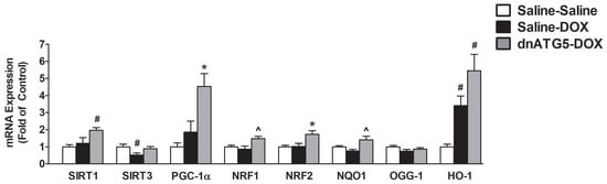 The histone deacetylases SIRT1 and SIRT3 have been implicated in the regulation of mitochondrial turnover and the antioxidant response via activation of PGC-1α, NRF1 and NRF2 signaling []. In this regard, our results showed a significant increase in SIRT1 in dnATG5-DOX animals compared to Saline-Saline, and a reduction in SIRT3 levels in Saline-DOX animals compared to Saline-Saline (Figure 8). In addition, the expression of PGC-1α and NRF2 was elevated in the dnATG5-DOX group compared to all others, whereas NRF1 was also increased in the dnATG5-DOX group compared to Saline-Saline. NRF2 can lead to enhanced antioxidant defense through activation of the antioxidant response element (ARE) signaling pathway [], and our results showed that NQO1 was elevated in the dnATG5-DOX group compared to Saline-DOX. In addition, HO-1 was upregulated in both the dnATG5-DOX and Saline-DOX groups compared to Saline-Saline. Finally, no changes were seen in the mRNA expression of OGG-1 between treatment groups.