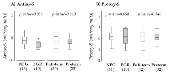 Maternal Antiox-S (A) and Prooxy-S (B) at 10 weeks of gestation. Data compare pregnant women with normal fetal growth (NFG) versus fetal growth restriction (FGR) and women with full-term versus preterm labor. Graphs show the median and interquartile range (IQR). Sample size is shown between brackets; *p < 0.05, U Mann–Whitney test.