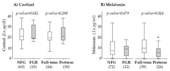 Maternal plasma cortisol (A) and melatonin (B) at 10 weeks of gestation. Data compare pregnant women with normal fetal growth (NFG) versus fetal growth restriction (FGR) and women with full-term versus preterm labor. Graphs show the median and IQR. Sample size is shown between brackets; *p < 0.05, U Mann–Whitney test.