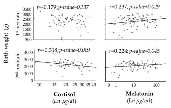 Scatter plots of birth weight vs. cortisol or melatonin levels. Line shows p < 0.05. Rho–Spearman test.