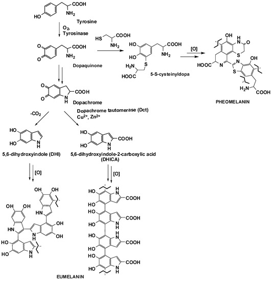 Melanins are the primary determinants of skin, hair and exoskeletal pigmentation in mammals, birds and insects [1,2,3,4,5,6], and their importance has been growing over the past few years not only from a biological point of view, related to their role in the human body, but also for the exploitation of their unique properties in biomedicine or in the cosmetic and health sectors [7,8,9,10,11,12,13,14,15,16]. These pigments are biosynthesized in melanocytes, starting with the oxidation of tyrosine to dopaquinone catalyzed by the enzyme tyrosinase (Figure 1) [1,17,18]. Dopaquinone may then undergo cyclization leading, after a further oxidation step, to 5,6-dihydroxyindole (DHI) or 5,6-dihydroxyindole-2-carboxylic acid (DHICA) whose oxidative polymerization ultimately leads to melanin pigments brown or dark in color, known as eumelanins [1,9,18]. On the other hand, entrapment of dopaquinone by cysteine, a process which is under genetic control, gives rise to isomeric cysteinyldopas whose polymerization is responsible for the biosynthesis of the reddish-brown pigments known as pheomelanins, typical of the red hair phenotype [1,19,20] (Figure 1).