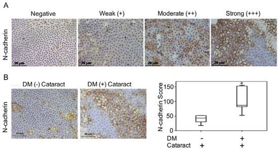 N-cadherin in diabetes mellitus (DM) (+) and DM (−) cataract patients. (A) Representative photomicrographs of cataract samples with N-cadherin labeled to score negative (−), weak (+), moderate (++), and strong (+++) expressions and the pathological phase of the cataracts (phase 1-4). (B) In DM (+) cataract patients, N-cadherin expression levels were higher than those in DM (−) cataract patients (p = 0.040). (C) Box plot of N-cadherin expression levels in DM (+) and DM (−) cataract patients. The presented values are the mean ± SEM (n = 10 per group, separate experimental groups in each figure). * p < 0.05.