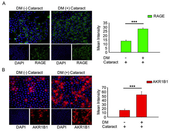 Expression of receptor for advanced glycation end products (RAGE) and AKR1B1 were higher in the lens in DM (+) cataract patients than in DM (−) cataract patients. (A) Representative green fluorescence images of green RAGE-positive and (B) red AKR1B1-positive cells in human lens epithelial sections from DM (+) or DM (−) cataracts. Cell nuclei were counterstained with DAPI (blue). Values are presented as means ± SEMs (n = 10 per group, separate experimental groups in each figure). *** p < 0.001.