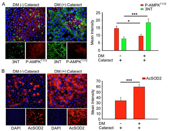DM (+) cataract patients had increased energy imbalance, increased reactive oxygen species (ROS) products, and lower superoxide dismutase 2 SOD2 activity than DM (−) cataract patients. (A) Representative photomicrographs of p-AMPKT172 (red) and 3-nitrotyrosine (3NT, green), and (B) of acetyl SOD2 (AcSOD2, red). DAPI (blue) was used to label cell nuclei. Values are presented as means ± SEMs (n = 10 per group, separate experimental groups in each figure). * p < 0.05 and *** p < 0.001.