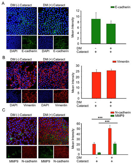 To determine the role of EMT in cataract formation, EMT markers of cataracts in DM and non-DM patients were analyzed (Figure 4). We observed that the expression of E-cadherin, an epithelial marker, was lower in DM (+) cataract tissues compared to DM (−) patients (p = 0.06, Figure 4A). We found that vimentin expression in DM (+) cataract tissues showed no significance compared to that in DM (−) patients (25.67 ± 1.4 vs. 24.2 ± 2.3; p = 0.07, Figure 4B). However, the mesenchymal marker N-cadherin, and matrix metalloproteinases 9 were increased significantly in DM (+) cataract patients compared to DM (−) cataract patients (Figure 4C), showing that the mesenchymal marker N-cadherin may play an important role in DM (+) cataract formation.