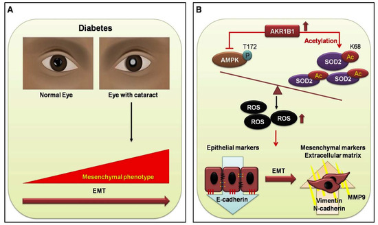 Previously, it was shown that sorbitol accumulation caused osmotic stress in the lens that led to epithelial cell apoptosis and cataract formation [16]. In fact, rapid glycemic control promotes a hypoxic environment that reduces protective enzymes and increases oxidative radicals. This study demonstrates that osmoregulation impairment leads to the lens being susceptible to AR-mediated osmotic stress and eventually, cataract formation. Overproduction of AKR1B1 and RAGE also plays a major role in diabetic cataract development. However, it is not yet known whether diabetic cataracts are related to lens epithelial cell EMT. In the present study of diabetic eye disease, we hypothesize that EMT in DM cataracts occurs through AKR1B1-enhanced AGE, and reactive oxygen species (ROS) generation influences the cataract development in DM. Based on our data, AKR1B1 overexpression may diminish AMPK activation, and increase AcSOD2- and RAGE-induced EMT in the lens epithelial cells (LECs) of diabetic cataracts.
