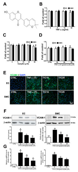Corylin reduces inflammation in tumor necrosis factor-α (TNF-α)-treated human umbilical vein endothelial cells (HUVECs) and vascular smooth muscle cells (VSMCs) by downregulating vascular cell adhesion protein-1 (VCAM-1) expression. (A) Chemical structure of corylin. HUVECs and VSMCs were treated with 0, 5, 10, or 20 ng/mL TNF-α alone for 24 h (B), 0, 5, 10, 20, or 40 µM corylin alone for 24 h, (C) or pretreated (1 h) with 10, 20 or 30 µM corylin and then treated with 10 ng/mL TNF-α for 24 h. (D) SRB assay was performed to observe cell viability. (E,F) Immunofluorescence staining and Western blot analysis were performed to evaluate the level of VCAM-1 protein expression. β-actin was used as an internal control for sample loading. Nuclei were labeled with DAPI (blue). (G) Quantitative real-time PCR was performed to evaluate the VCAM-1 mRNA expression. HUVECs or VSMCs were pretreated (1 h) with 10 or 20 µM corylin (C10 or C20) and then treated with 10 ng/mL TNF-α (T) for 6 h. The data are shown as the mean ± SD. * p < 0.05 versus the untreated group (CTRL). † p < 0.05 versus the TNF-α-treated group. Scale bars = 50 μm (E).