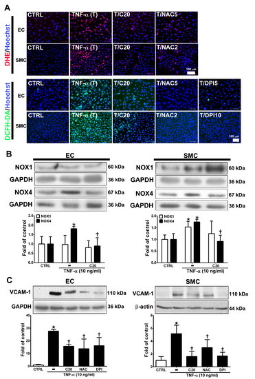 Corylin reduces VCAM-1 expression in TNF-α-treated HUVECs and VSMCs through reactive oxygen species (ROS) inhibition. (A) HUVECs and VSMCs were treated with 20 µM corylin (C20), 2 or 5 mM NAC (NAC2 or 5), and 5 or 10 µM DPI (DPI5 or 10) and then treated with 10 ng/mL TNF-α (T) for another 30 min or 3 h. The treated cells were stained with H2DCFDA or DHE. The intracellular ROS levels were monitored by fluorescence microscopy. Nuclei were labeled with Hoechst (blue). (B) HUVECs and VSMCs were pretreated (1 h) with corylin (C20) and then treated with 10 ng/mL TNF-α (T) for 6 h. Western blot analysis and quantification of NOX1 and NOX4 protein expression. (C) HUVECs and VSMCs were treated with 20 µM corylin (C20), 2 or 5 mM NAC, and 5 or 10 µM DPI and then treated with 10 ng/mL TNF-α (T) for 24 h. Western blot analysis for VCAM-1 and quantification of VCAM-1 to GAPDH or β-actin in HUVECs or VSMCs. * p < 0.05 versus the untreated group (CTRL). † p < 0.05 versus the TNF-α-treated group. Scale bars = 100 μm (A).