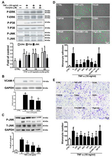 Corylin reduces monocyte adhesion and transmigration in TNF-α-treated HUVECs through inhibiting the ROS/JNK signaling pathway. HUVECs were treated with 20 µM corylin for 1 h and then incubated with or without 10 ng/mL TNF-α for 15 min. Phosphorylated (A) ERK, P38, and JNK levels were examined by Immunoblot analysis. Total ERK (T-ERK), total P38 (T-P38), and total JNK (T-JNK) were used as an internal control for sample loading. (B) HUVECs were pretreated (1 h) with corylin (20 µM; C20) and a JNK inhibitor (SP600125; 30 nM; SP30) and then treated with 10 ng/mL TNF-α for 24 h. VCAM-1 expression was analyzed by Western blotting analysis. GAPDH was analyzed in parallel as an internal control for protein loading. (C) HUVECs were pretreated (1 h) with corylin (20 µM; C20) and antioxidants (NAC; DPI) and then treated with 10 ng/mL TNF-α for 15 min. Phosphorylated JNK expression was analyzed by Western blotting analysis. T-JNK or GAPDH was analyzed in parallel as an internal control for the protein loading. (D) Confluent HUVECs were pretreated (1 h) with 20 µM corylin (C20), 30 nM SP600125 (SP30), 5 mM NAC, 5 µM DPI, 10 µM parthenolide (PAR), and 1 µg/ml anti-VCAM-1 antibody or IgG and then with 10 ng/mL TNF-α (T) for 24 h. BCECF/AM-labeled U937 cells were added and cocultured for another 1 h. The adherent U937 cells were counted to evaluate the overall VCAM-1 expression level. (E) HUVECs were pretreated (1 h) with 20 µM corylin or 30 nM SP600125 (SP30), 5 mM NAC, 5 µM DPI, 10 µM parthenolide (PAR), and 1 µg/mL anti-VCAM-1 antibody or IgG and then treated with 10 ng/mL TNF-α for 24 h. U937 cells were added to the upper well for another 6 h; then, the transmigrated U937 cells were stained and counted. The data are shown as the mean ± SD. * p < 0.05 versus the untreated group (CTRL). † p < 0.05 versus the TNF-α-treated group. Scale bars = 100 μm (E).