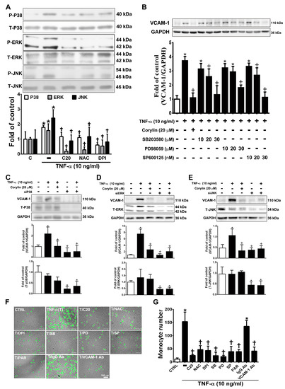 Corylin reduces VCAM-1 expression in TNF-α-treated VSMCs through ROS/MAP kinase inhibition. VSMCs were treated with 20 µM corylin, 2 mM NAC or 10 µM DPI for 1 h and then incubated with or without 10 ng/mL TNF-α for 15 min. (A) Phosphorylated P38, ERK, and JNK levels were examined by Immunoblot analysis. Total ERK (T-ERK), total P38 (T-P38), and total JNK (T-JNK) were used as an internal control for sample loading. (B) VSMCs were pretreated (1 h) with corylin (20 µM), a P38 inhibitor (SB203580; SB; 10, 20, or 30 µM), PD98059 (PD; 10, 20, or 30 µM), or a JNK inhibitor (SP600125; SP; 10, 20, or 30 nM) and then treated with 10 ng/mL TNF-α for 24 h. Western blot analysis for VCAM-1 and quantification of VCAM-1 to GAPDH in VSMCs. (C–E) After P38, ERK and JNK silencing, cells were treated with TNF-α and corylin. VCAM-1 expression was determined by Western blot analysis. Total P38 (T-P38), total ERK (T-ERK), and total JNK (T-JNK) proteins were used to examine the siRNA effects. GAPDH was used as an internal control for sample loading. (F,G) Confluent VSMCs were pretreated (1 h) with 20 µM corylin (C20), 30 µM SB203580 (SB), 30 µM PD98059 (PD), 30 nM SP600125 (SP), 10 µM parthenolide (PAR), and 1 µg/mL anti-VCAM-1 antibody or IgG and then treated with 10 ng/mL TNF-α (T) for 24 h. BCECF/AM-labeled U937 cells were added and cocultured for another 1 h. The adherent U937 cells were counted to evaluate the overall VCAM-1 expression level. The data are shown as the mean ± SD. * p < 0.05 versus the untreated group (CTRL). † p < 0.05 versus the TNF-α-treated group. Scale bars = 100 μm (F).