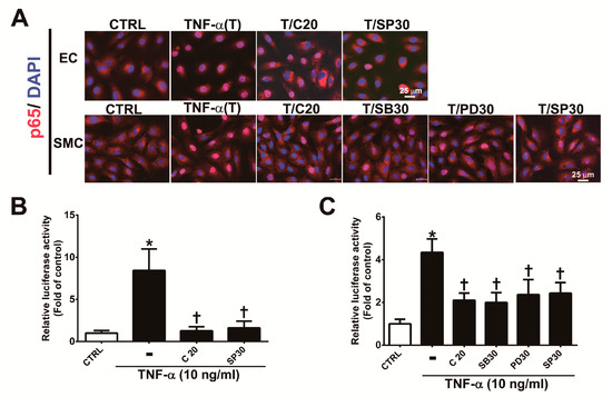 Corylin reduces the activation of NF-κB p65 in TNF-α-treated HUVECs and VSMCs. (A) HUVECs were pretreated (1 h) with 20 µM corylin (C20) or 30 nM SP600125 (SP30) and then incubated with 10 ng/mL TNF-α (T) for 15 min. VSMCs were pretreated (1 h) with 20 µM corylin, 30 µM SB203580 (SB30), 30 µM PD98059 (PD30), or 30 nM SP600125 (SP30) and then incubated with 10 ng/mL TNF-α (T) for 15 min. Immunofluorescence staining was performed to examine the nuclear localization and expression level of phosphorylated NF-κB p65 (P-p65). Nuclei were labeled with DAPI (blue). Scale bar = 25 μm. (B,C) HUVECs and VSMCs were transfected with NF-κB p65 luciferase reporter constructs, pretreated (1 h) with 20 µM corylin (C20), 30 µM SB203580 (SB30), 30 µM PD98059 (PD30), or 30 nM SP600125 (SP30) and then incubated with 10 ng/mL TNF-α for 6 h. Total cell lysates were collected, and luciferase activity was detected. The data are shown as the mean ± SD. * p <0.05 versus the untreated group (CTRL). † p < 0.05 versus the TNF-α-treated group.