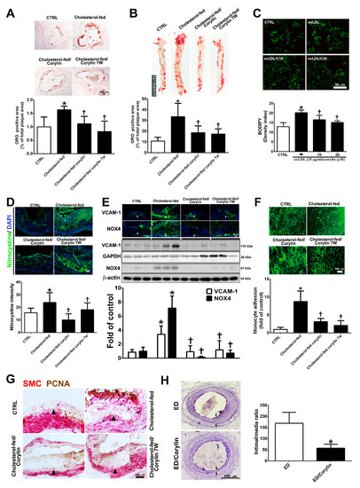 To investigate the anti-atherosclerotic effect of corylin, a histomorphometric analysis of aortic sinus and thoracic aorta sections from ApoE-deficient mice fed a high cholesterol diet for 15 weeks were quantified. As shown in Figure 8A,B, Oil Red O staining of the aortic sinus and thoracic aortae showed that the ratio of the area with atherosclerotic plaques was markedly higher in the high cholesterol diet group than in the standard chow diet group, and corylin treatment (in both the prevention and treatment groups) significantly lessened the atherosclerotic plaque. OxLDL mediates the transformation of macrophages to lipid-laden foam cells, which is a feature of atherosclerotic plaques [34]. In addition, corylin remarkably decreased foam cell formation in oxLDL-treated RAW264.7 macrophages (Figure 8C). Oxidative stress is a key event in atherogenesis [35]. Oxidative stress expression was determined by nitrotyrosine staining. The results showed that oxidative stress marker expression was decreased significantly by corylin treatment (Figure 8D). According to immunohistochemistry staining and Western blot analysis, the VCAM-1 and NOX4 expression levels in the thoracic aortae from ApoE-deficient mice in the cholesterol-fed group were higher than those in the control group (Figure 8E). Corylin treatment (in both the prevention and treatment groups) significantly decreased the VCAM-1 and NOX4 protein expression levels compared with cholesterol feeding alone. Because leukocyte adhesion to the arterial intima plays an important role in the initiation and progression of atherosclerosis, we used labeled monocytes to directly determine whether corylin inhibits early monocyte recruitment to atherosclerotic lesions. The numbers of labeled monocytes in the arteries were higher in high cholesterol diet-fed group than in standard chow diet group. Corylin treatment (in the prevention and treatment groups) dramatically decreased the numbers of monocytes that adhered to the arterial intima compared with cholesterol feeding alone (Figure 8F). The proliferation and migration of VSMCs play an important role in the progression of atherosclerosis [36,37]. To detect VSMC proliferation in atherosclerotic plaques, PCNA and α-actin staining were used. As shown in Figure 8G, the number of PCNA-positive SMCs in the thickened plaques was higher in the cholesterol-fed group than in the corylin-treated group (in the prevention and treatment groups). The antihyperplasia effects of corylin were also observed in denuded mice (Figure 8H). Taken together, these findings show that corylin significantly reduced atherosclerotic lesion progression.