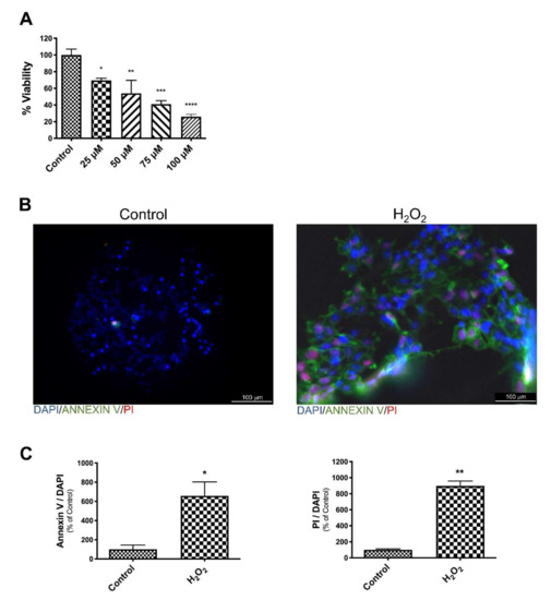 H2O2 affects SK-N-BE cell viability. Cell viability decrease after treatments with different concentration of H2O2 (A). representative images of DAPI, Annexin V-FITC and PI triple fluorescence staining showing cellular apoptosis after H2O2 treatment. DAPI: blue; AnnexinV: green; PI: red (B). Histograms reports quantification of fluorescence of DAPI, Annexin V, and PI (C). The bars represent ± the average ± SD of independent experiments (n = 3). Statistically significant difference compared to control cells: * p ≤ 0.05, ** p ≤ 0.01, *** p ≤ 0.001, **** p ≤ 0.0001.