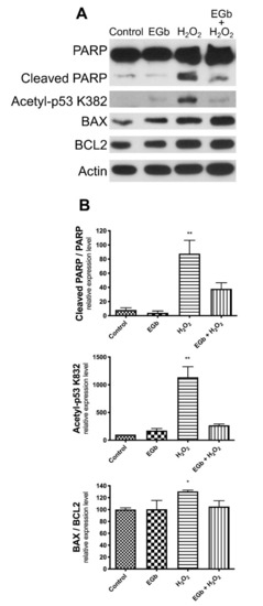 To confirm that EGb could protect cells against apoptotic cell death induced by oxidative stress, we first analysed the presence of poly(ADP-ribose) polymerase (PARP) cleavage, an hallmark of apoptosis. As expected, PARP cleavage increased after H2O2 treatment, although the cells were completely protected from oxidative stress-induced apoptosis in presence of EGb (Figure 3A,B). Then, to study the protective mechanism of EGb against oxidative stress-induced apoptosis, we investigated the molecular signalling pathway involved in the apoptotic cell death analysing p53 expression.