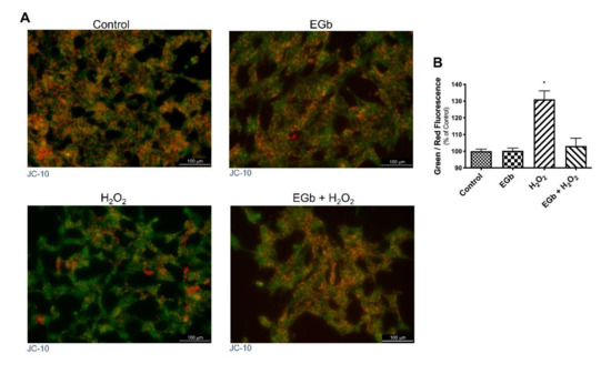 3.3. EGb Mitigated the H2O2 Induced Decrease in Mitochondrial Membrane Potential