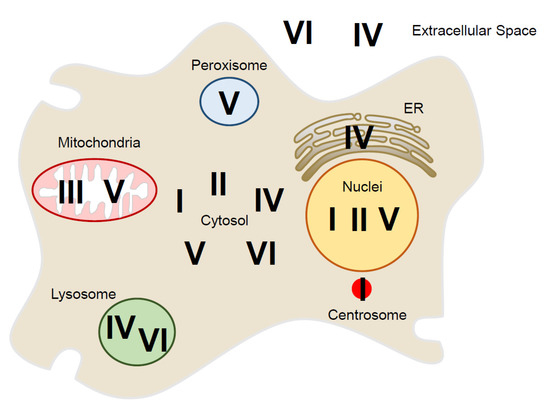 Mammalian Prx isoforms localize to specific cellular compartments, including the cytosol, and to organelles such as mitochondria, peroxisomes, lysosomes, and the nucleus, as well as localizing outside the cell [13,47,48,49] (Figure 2, Table 1). PrxI was localized in moderate amounts in the nucleus, cytosol, and plasma membrane [50,51]. In addition, a recent study described local regulation of H2O2 around the centrosome through PrxI phosphorylation by Cdk1 during early mitosis [17]. PrxII was observed primarily in the cytosol, with distribution similar to PrxI, although some was found in the nucleus and involved in protection of cancer cell death from DNA damage [52]. PrxIII was found almost exclusively in the matrix of mitochondria, which is mainly responsible for reversible regulation of mitochondrial H2O2 levels [53,54]. While PrxIV was found in both cytosol and extracellular fluid, it was the only isoform found in the ER [55,56]. Protein disulfide isomerase was oxidized by ER-localized PrxIV in the oxidative protein-folding pathway [57,58,59]. PrxV was found predominantly in the mitochondria, with some in the peroxisome, and low levels in cytosol and nucleus [60,61,62]. PrxV antioxidant enzyme protects against oxidant-generating peroxisome, containing several molecules that catalyze the oxidation of substrates and thereby produce H2O2 [63]. PrxVI was located predominantly in the cytosol, but it was also expressed in lysosomal compartments with PrxIV [49,64]. Phosphorylation of PrxVI by the MAP kinase increases its PLA2 (phospholipase A2) activity [65,66,67].