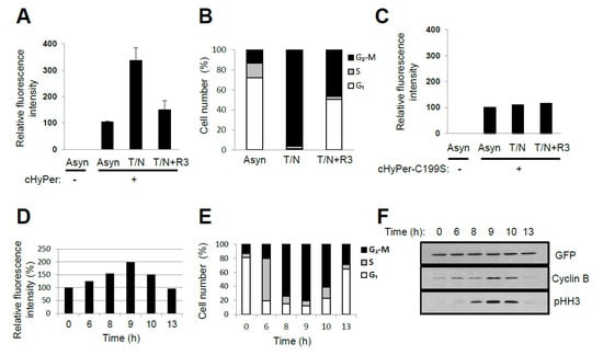 Oscillation of H2O2 levels during the cell cycle (experimental data by the authors): (A,B) HeLa cells expressing cytosolic HyPer (cHyPer) were arrested at prometaphase by treatment with thymidine and nocodazole (T/N) and then released into G1 phase by shaking off into fresh medium and incubation for 3 h (T/N+R3). The fluorescence intensity of cHyPer was measured by flow cytometry, and the relative levels of H2O2 were estimated (A) for asynchronous, T/N, and T/N+R3 cells. Asynchronous HeLa cells that were not transfected with the cHyPer vector were analyzed similarly. Cell cycle status was also determined by flow cytometric analysis after staining with propidium iodide (B). Data in (A) are means ± SD from three independent experiments. (C) The relative fluorescence intensity of cHyPer–C199S was measured as in (A). Data are from a representative experiment. (D–F) HeLa cells expressing cHyPer were arrested at G1–S with a double-thymidine block and released into fresh medium. The relative levels of H2O2 were measured by flow cytometry at the indicated times after the release (D). Cell cycle status was also analyzed by flow cytometry after staining with propidium iodide (E), and the expression of cell cycle marker proteins was examined by immunoblot analysis (F). cHyPer is detected with antibodies to green fluorescent protein. Data are from a representative experiment. pHH3, phosphorylated histone H3. Rabbit polyclonal antibodies to Ser10-phosphorylated histone H3 (pHH3) (from Upstate Biotechnology) were used to detect mitotic cells. For analysis of cell cycle stage, cells (5 × 105/mL) were washed twice with ice-cold phosphate-buffered saline, fixed overnight at 4 °C in 70% ethanol, and stained with 1 mL of a solution containing RNase (50 μg/mL) and propidium iodide (50 μg/mL) before flow cytometry with a FACSCalibur instrument (BD Biosciences, Franklin Lakes, USA). For measurement of the intracellular level of H2O2, cells expressing cHyPer or cHyPer-C199S were analyzed at an excitation wavelength of 488 nm.