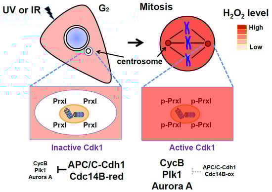 Centrosomes are microtubule-organizing centers that play key roles in spindle formation, chromosome segregation, cell cycle progression, and cell division throughout the cell cycle [74]. In a recent study, we proposed a role for PrxI associated with centrosomes for mitotic entry [17] (Figure 4). Many proteins that participate in the mitotic entry network (Cdk1, cyclin B, Cdc25B, Cdc25C, Plk1, and Aurora A) or in the mitotic exit network (APC/C, Cdc14B, and Cdh1) are concentrated at the centrosome [19,75,76,77,78,79,80]. Several feedback loops that underlie activation of Cdk1 and amplification of Cdk1 activity are initiated by cyclin B, Cdc25B, Cdc25C, Plk1, and Aurora A at the centrosome. Mitotic exit processes related to the activation of APC/C–Cdh1 by Cdc14B, which results in the degradation of mitotic activators (cyclin B, Plk1, and Aurora A), also have been suggested to be integrated at the centrosome [81].