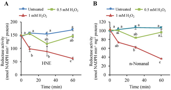 Effects of H2O2 on the NADPH-dependent HNE-reducing and n-nonanal-reducing activities in tobacco BY-2 cells. Four-d cultured cells were treated with H2O2 at 0.5 mM and 1 mM, as in Figure 1. Then, cells were harvested at the indicated time point, and proteins were extracted as in the Materials and Methods section. The reductase activities for (A) HNE and (B) n-nonanal were determined as in the Materials and Methods section. Each point represents the mean of three independent experiments and the error bars of the SEM. Different letters represent significantly different values (p < 0.05 on Tukey test).